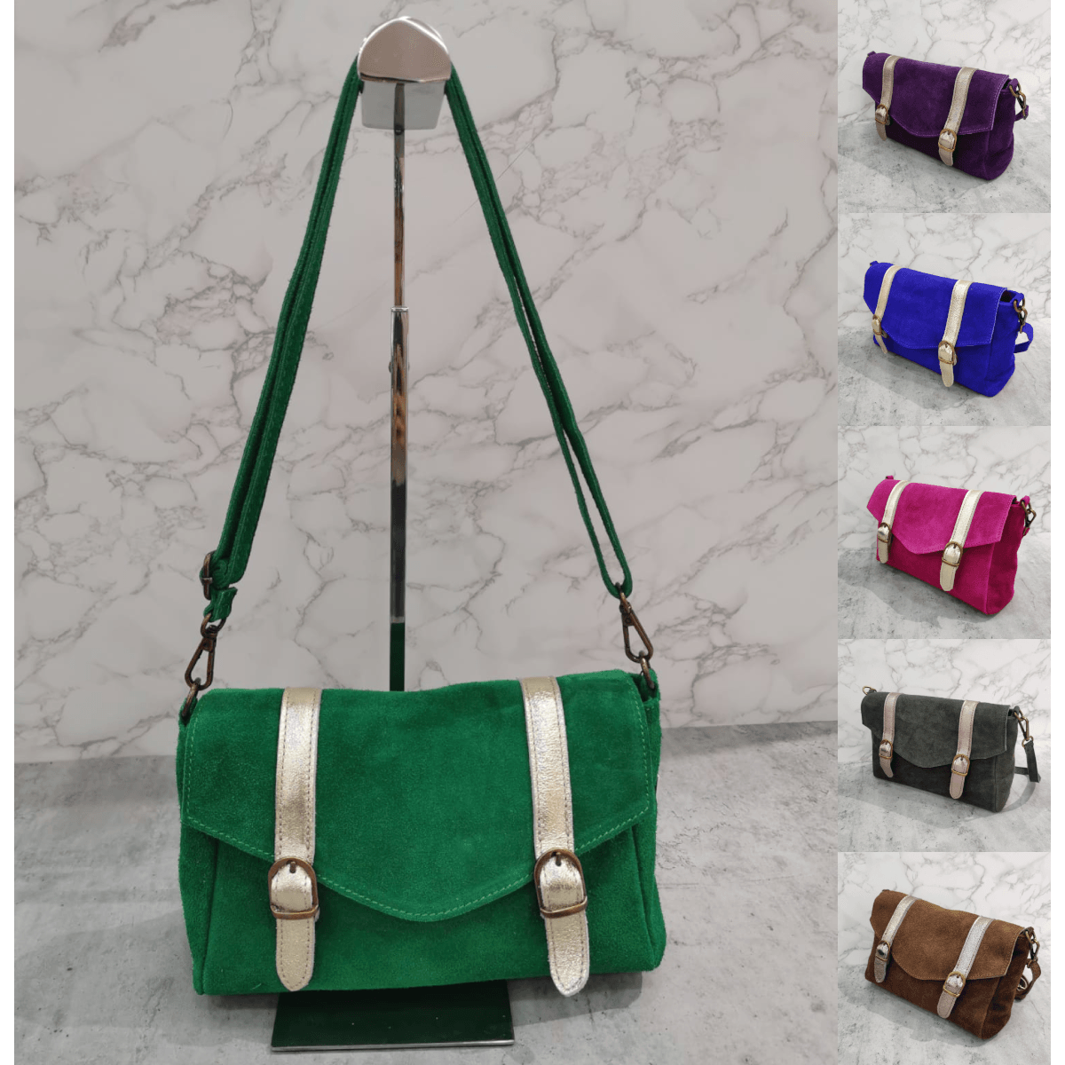 Sac pochette besace fabriqué dans une croûte de cuir au toucher soyeux.