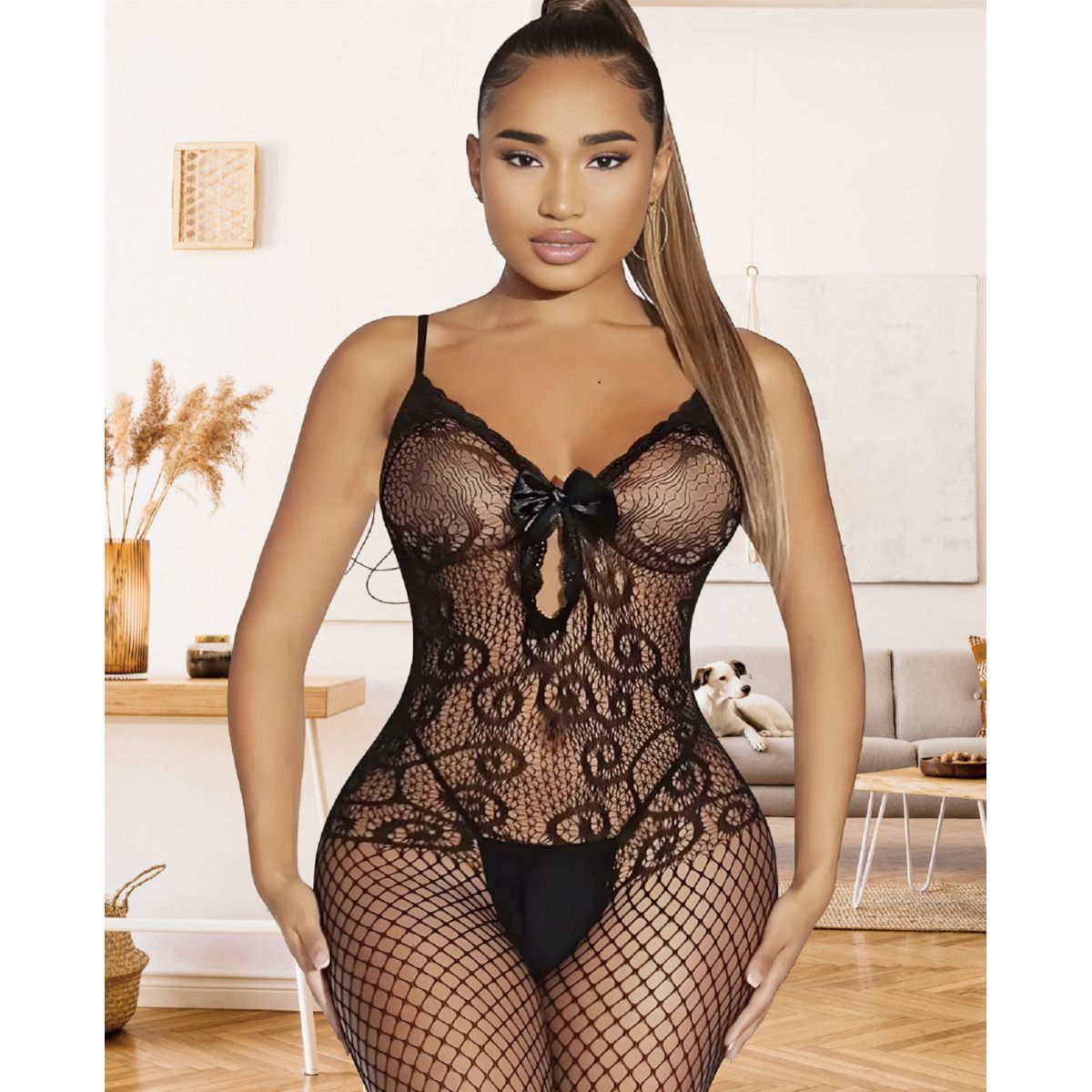 Sa maille résille ajourée s’étend sur toute la silhouette, des épaules jusqu’aux pieds.