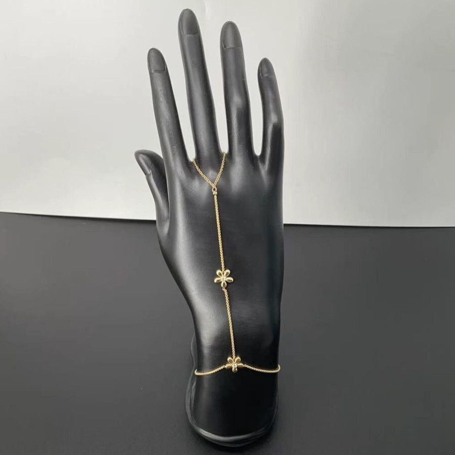 Une chaîne fine relie une bague au bracelet, sublimant le dos de la main.