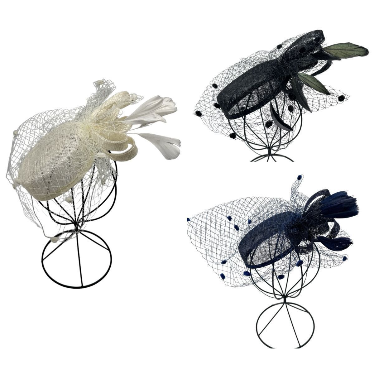 Orné d'une voilette en tulle fin, de couleur assortie, qui recouvre partiellement le visage.