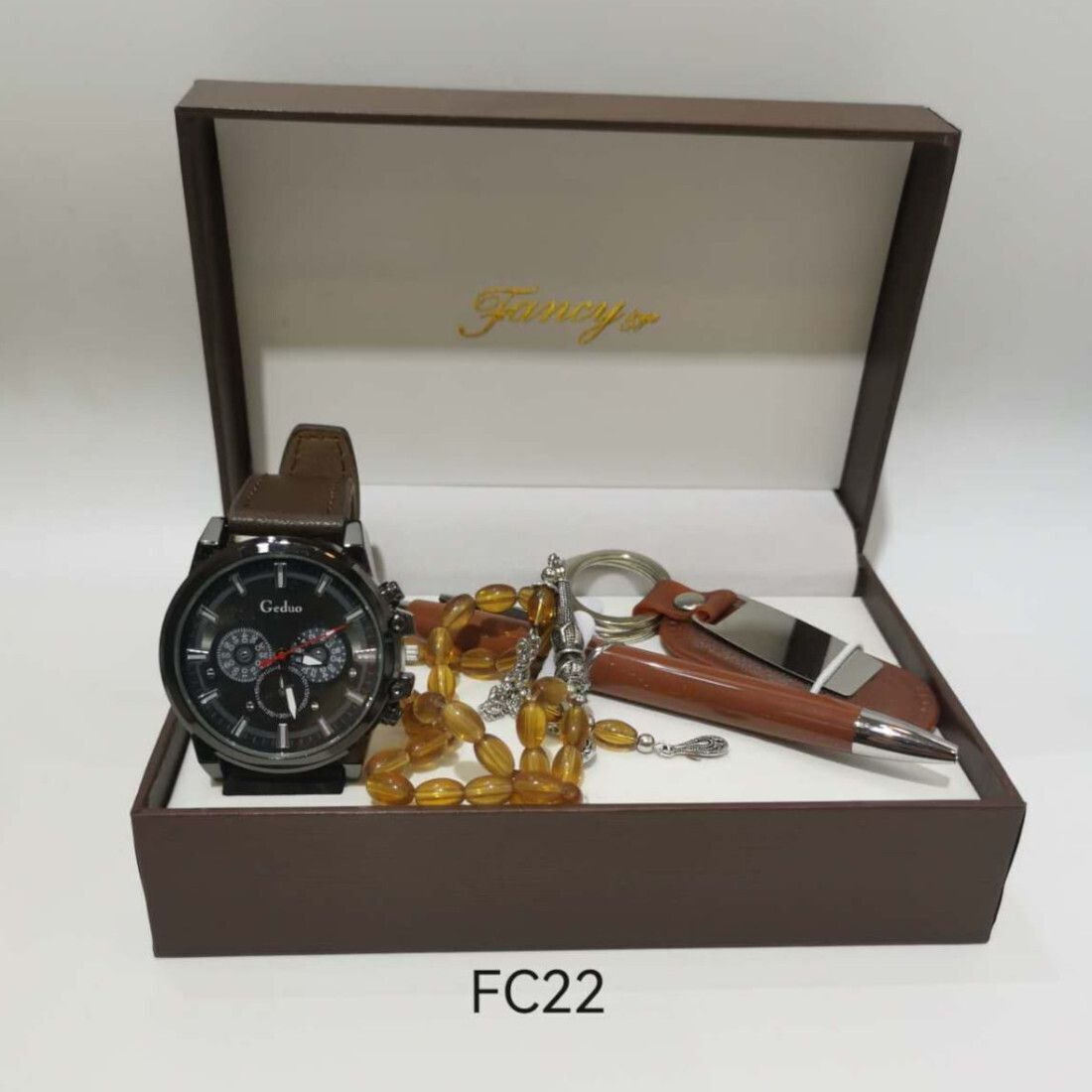 Il contient une montre, un chapelet, un stylo et un porte-clés que vous pouvez graver par vos soins.