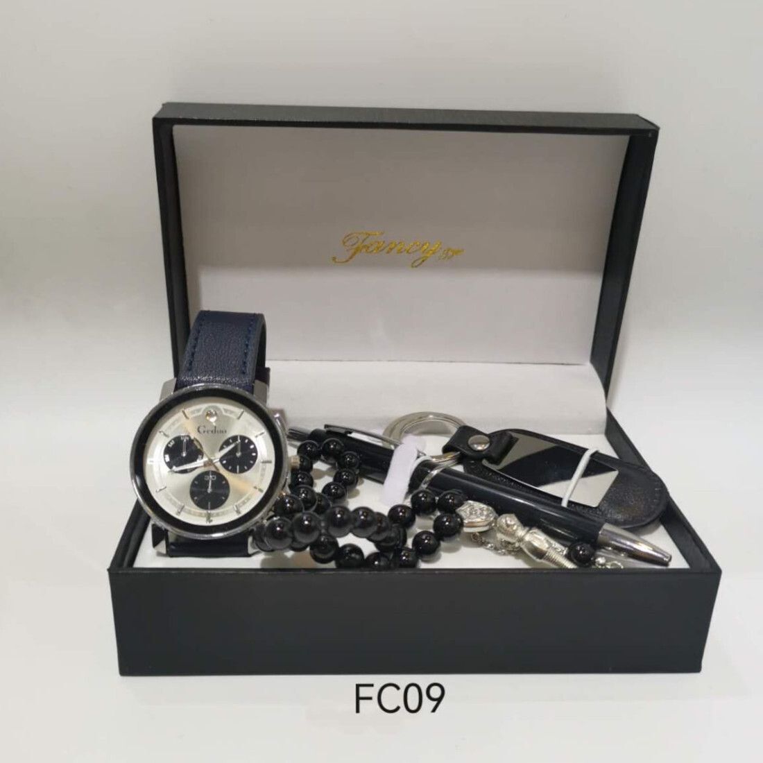 Coffret incluant une montre, un chapelet, un stylo et un porte-clés à graver pour un cadeau sur mesure.
