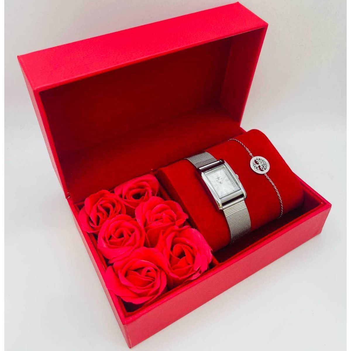 Cette montre est présentée dans un coffret rouge vif, accompagnée de roses rouges et d’un bijou raffiné.
