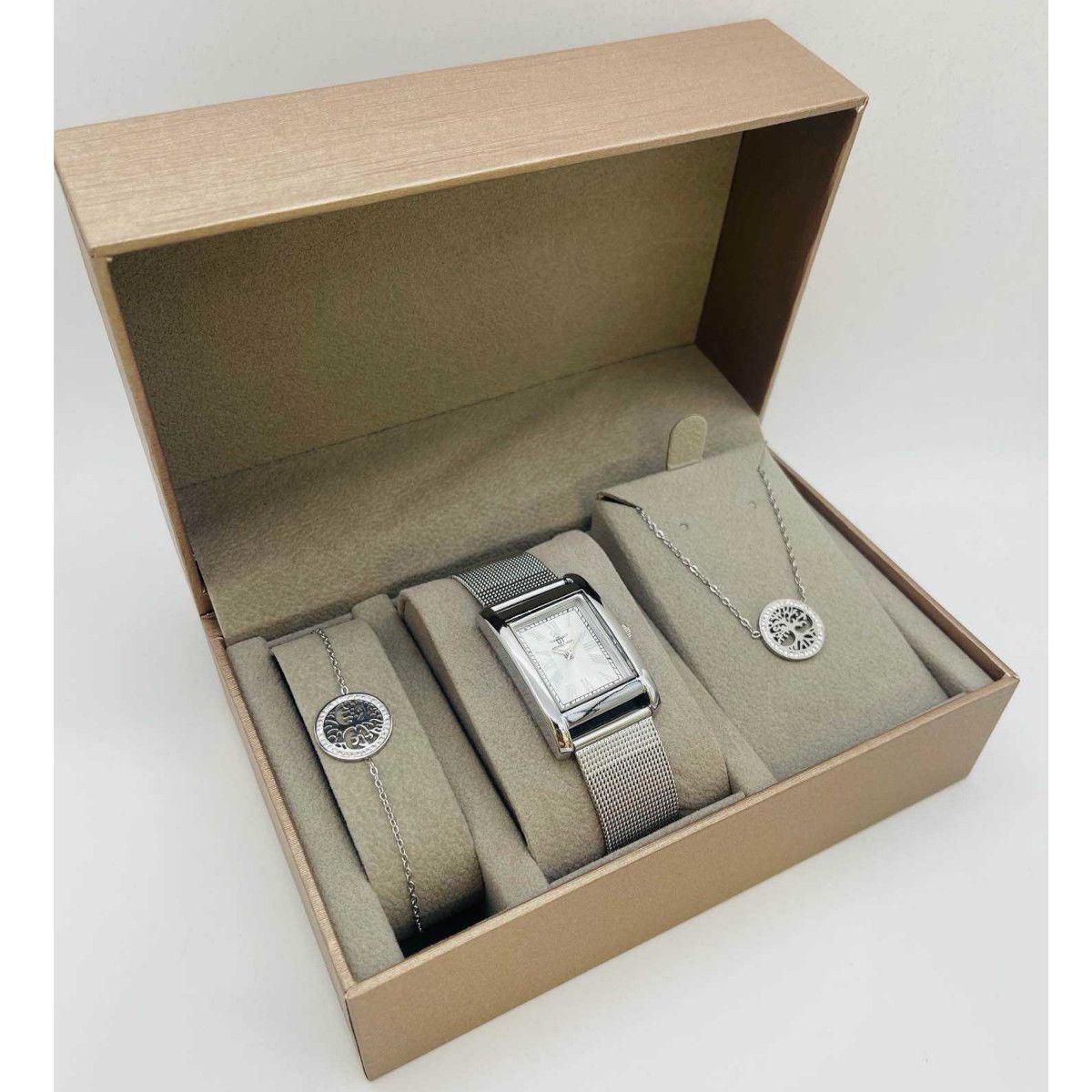 Coffret montre femme 24 mm accompagné de bracelet en acier.