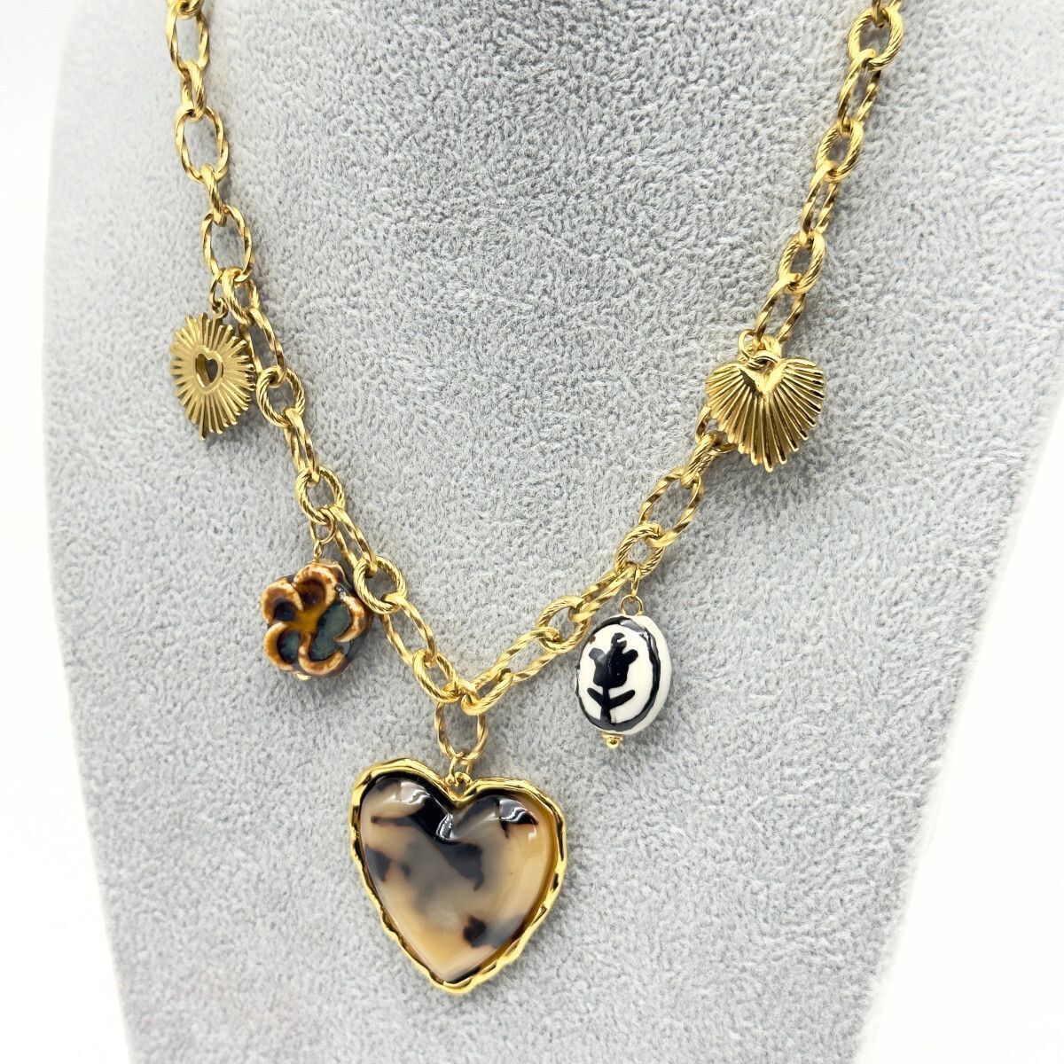Breloque principale : cœur central marron et beige à motif écaille, entouré d’un contour doré.