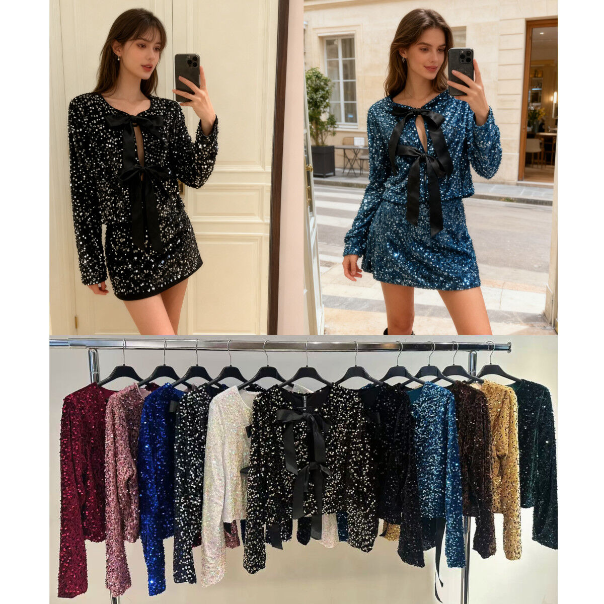 Top pailleté féminin avec nœuds en satin, parfait pour l’hiver.