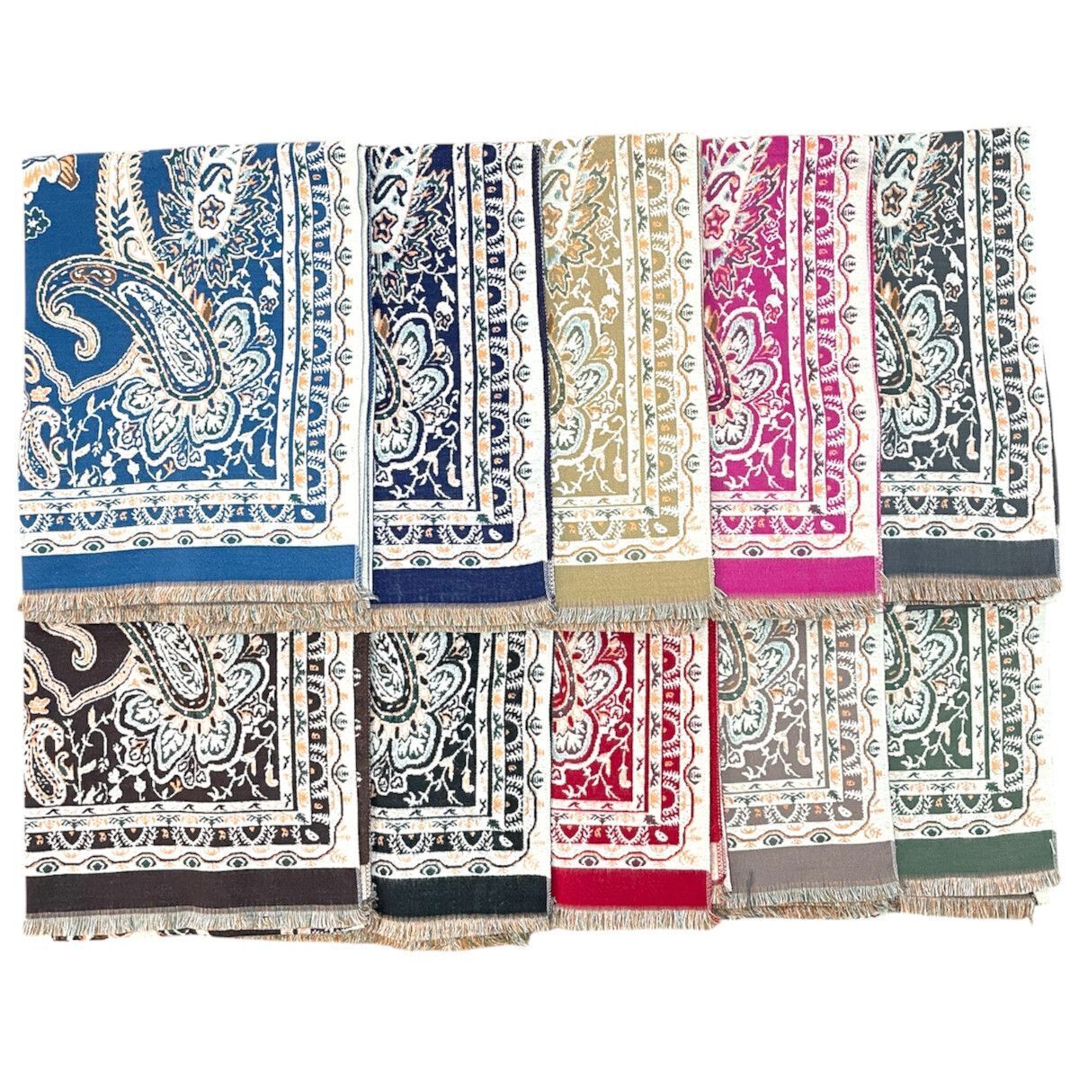 Les extrémités se terminent par des franges colorées, reprenant les nuances du motif.