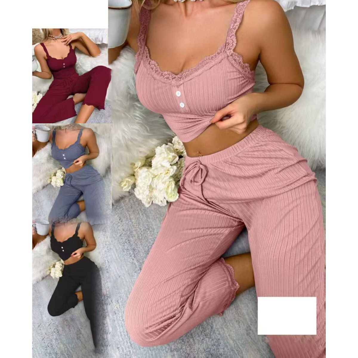 L’ensemble inclut un pantalon long et un haut sublimé par de subtils accents de dentelle.