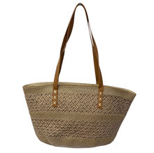 Le sac de plage, en forme de cabas, est conçu en papier tressé, offrant à la fois légèreté et résistance.