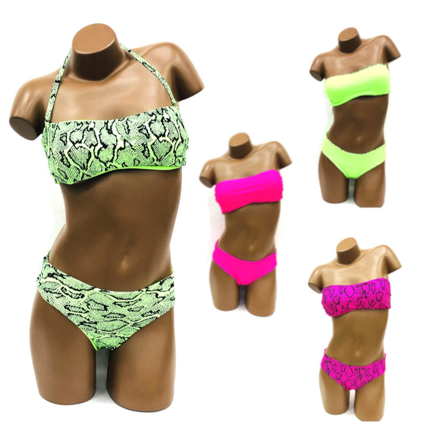 Un haut de maillot forme bandeau réversible couleur uni et imprimé reptile.