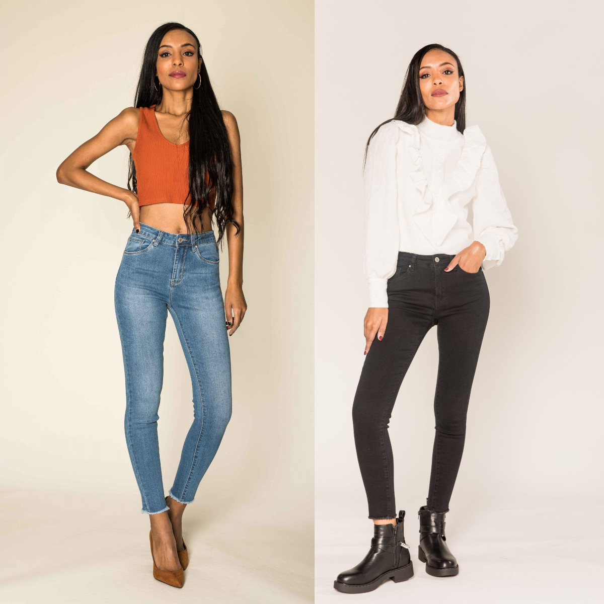 Jean en denim coupe skinny près du corps à taille haute avec le bas de jambe effiloché.