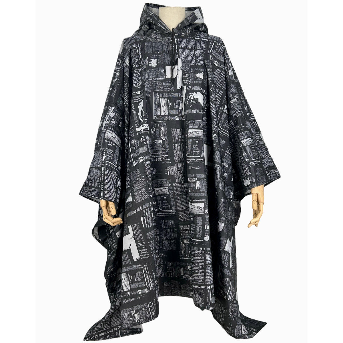 Poncho de pluie à capuche, orné d’un imprimé journal sur toute la surface.