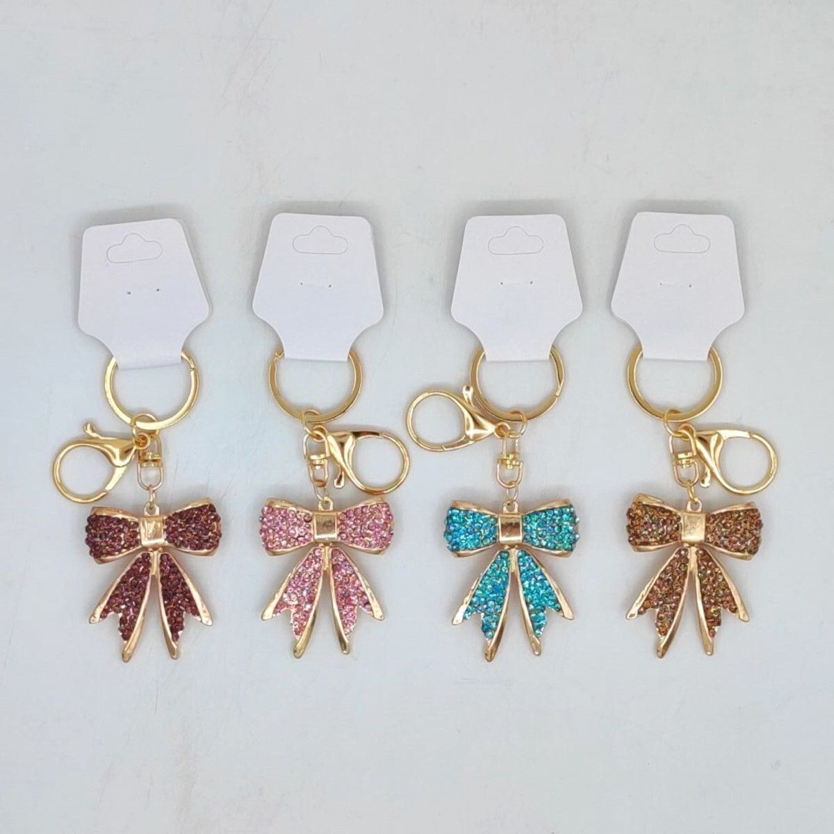 Ce porte-clés est façonné en métal doré et orné d’une multitude de strass scintillants.