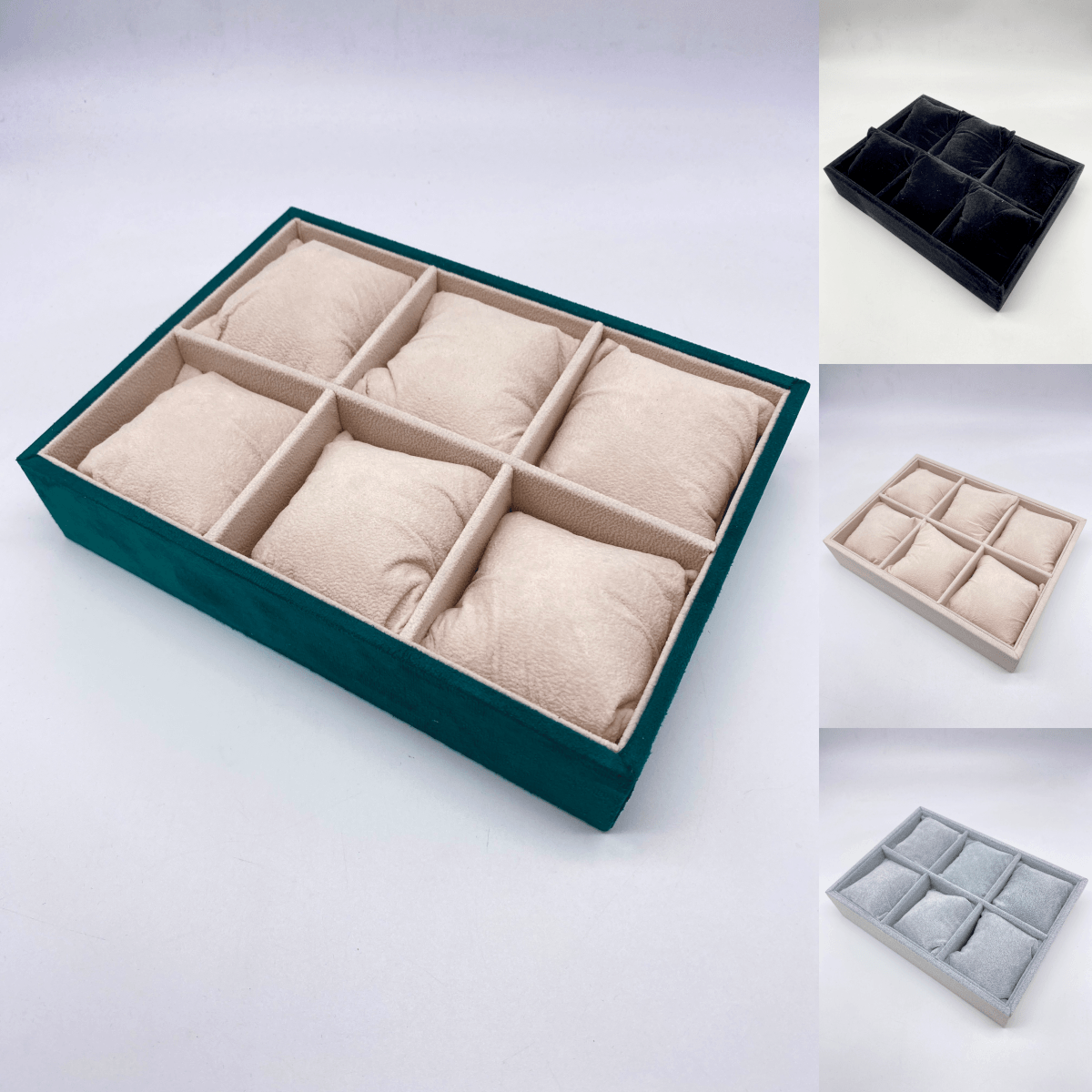 Dispose de 6 compartiments avec coussin pour montres et bracelets.