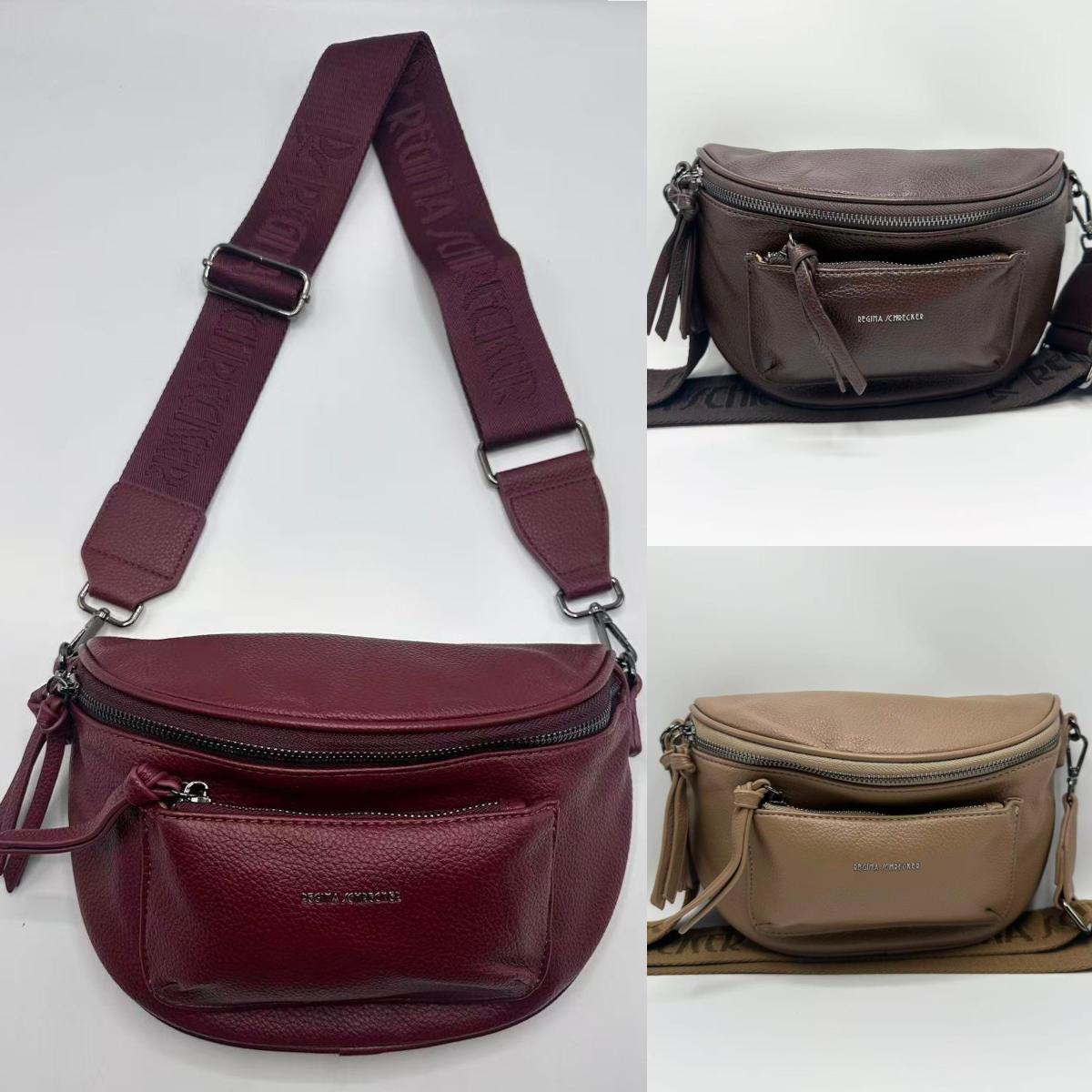 La sangle en tissu arbore le nom de la marque « REGINA SCHRECKER » en relief.