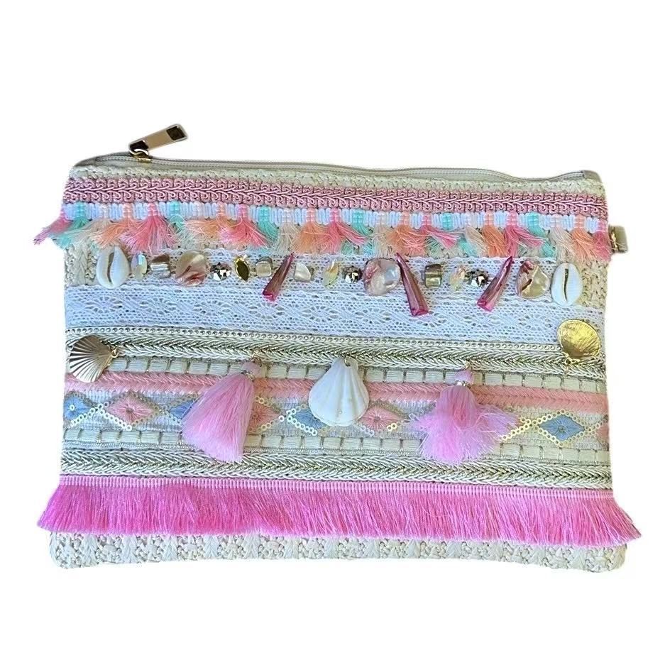 Sac pochette au design richement texturé, évoquant une esthétique bohème et estivale.