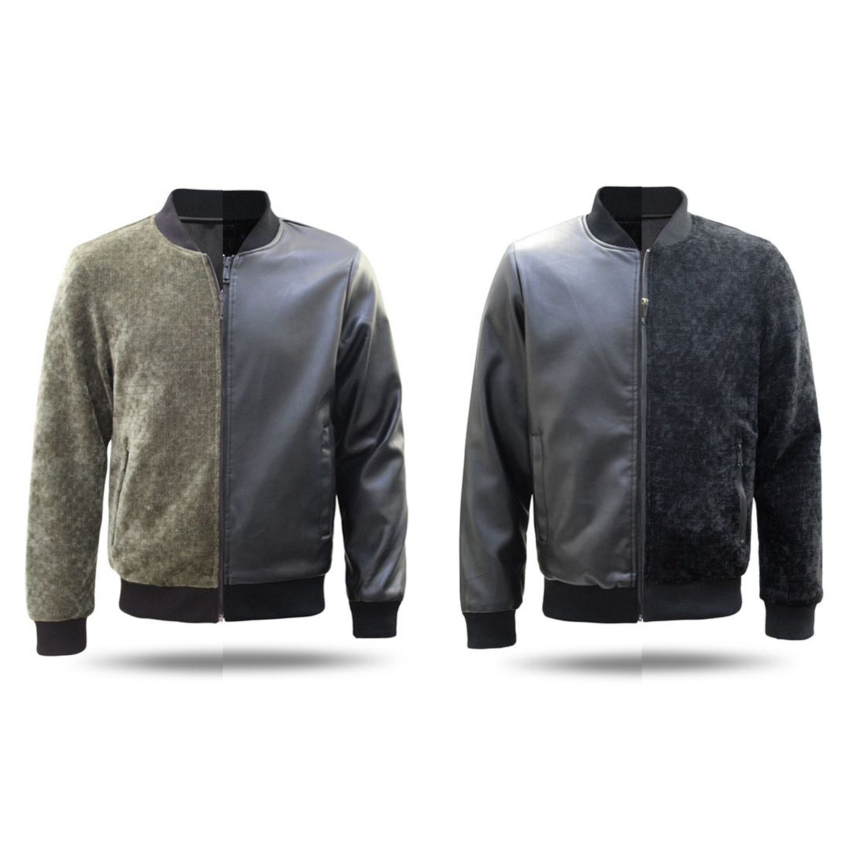 Cette veste réversible en simili cuir et velours peut être portée des deux côtés.