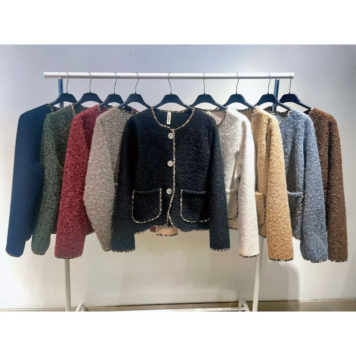 Veste douce et texturée, ornée de bordures léopard et de boutons dorés, pour une allure chic et élégante.